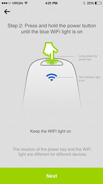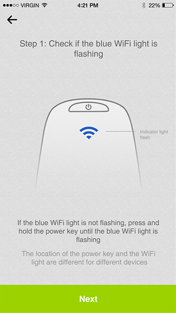 3. Click “Next” on next screen (Step 1: Check if the blue WiFi light is flashing);