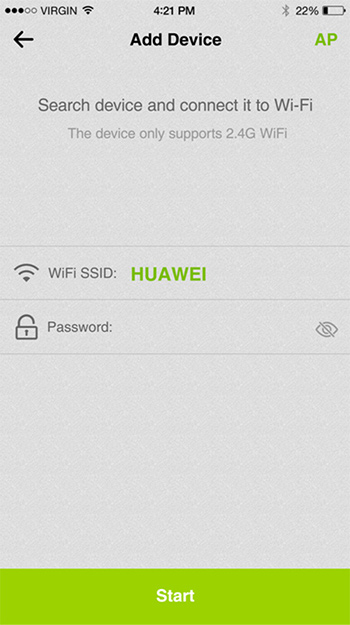 9. Input your 2.4 GHz Wi-Fi password; please make sure you input the right SSID and password, then click “Start” button;