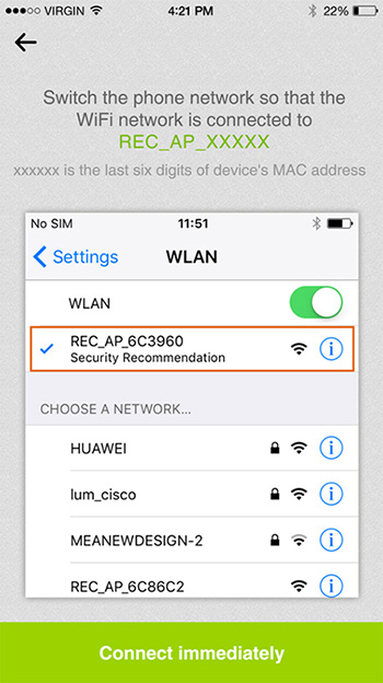 8. REC app will bring you to your phone’s WiFi settings: choose “REC_AP_XXXXXX” from the available WiFi list, where XXXXXX is the last six digits of your REC’s MAC address; then come back to REC app