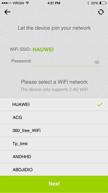 9. Input your 2.4 GHz Wi-Fi password (please make sure you input the right SSID and password), then click “Start” button;